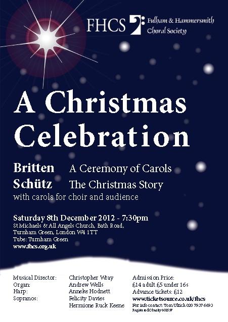 This Christmas season I will be singing with a couple of choral groups in West London. The first of these concerts will be a program of Benjamin Britten’s “A Ceremony of Carols”, Heinrich Schütz’s “Christmas Story”, and carols sung with the audience. This beautiful music will be heard in Chiswick’s own St. Michael and All Angels Church.
